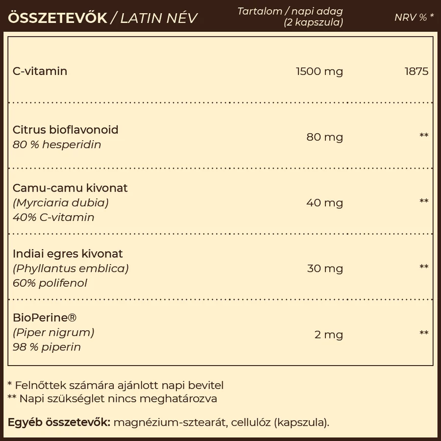 | Napi 2 kapszula szedése javasolt , amely biztosítja a szükséges C-vitamin mennyiséget (1500 mg) a szervezet számára. Ez az adagolás ideális a mindennapi immunrendszer támogatására és a szervezet antioxidáns védekezésének erősítésére. | |